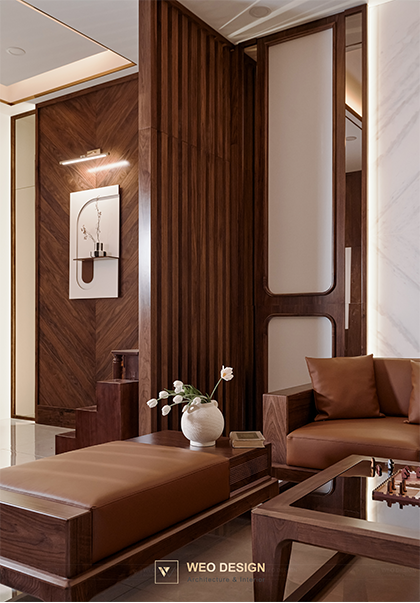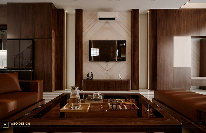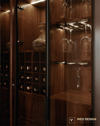 Hệ tủ và các hạng mục nội thất chính sử dụng MDF lõi xanh phủ Melamine và Plywood phủ Veneer Óc Chó, giúp đảm bảo độ ổn định kết cấu, hạn chế cong vênh, đồng thời giữ được màu sắc và vân gỗ gần với gỗ tự nhiên. Những vị trí cần điểm nhấn, tiếp xúc trực tiếp hoặc yêu cầu cao về cảm giác chạm được ưu tiên sử dụng gỗ Óc Chó tự nhiên, tạo chiều sâu và giá trị lâu dài cho không gian.
