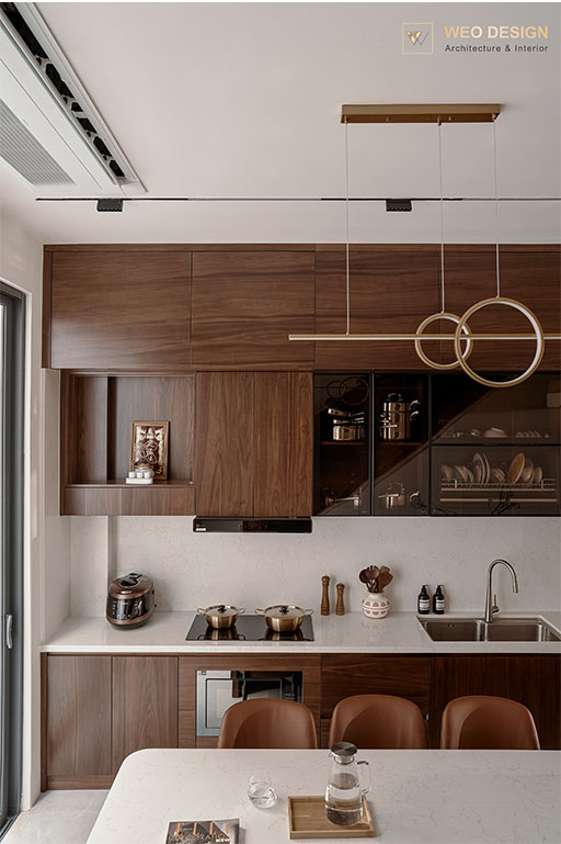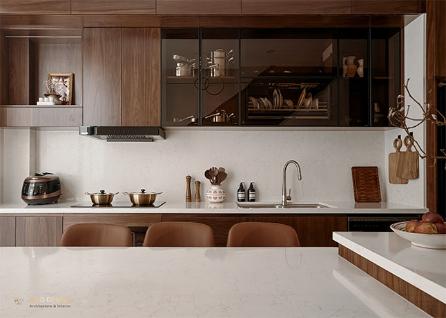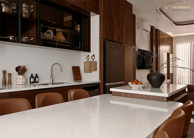 Sự kết hợp vật liệu có chủ đích này không chỉ giúp tối ưu chi phí đầu tư, mà còn mang lại một tổng thể nội thất đồng nhất về ngôn ngữ thiết kế, sang trọng nhưng không phô trương, phù hợp với nhịp sống hiện đại của gia chủ.