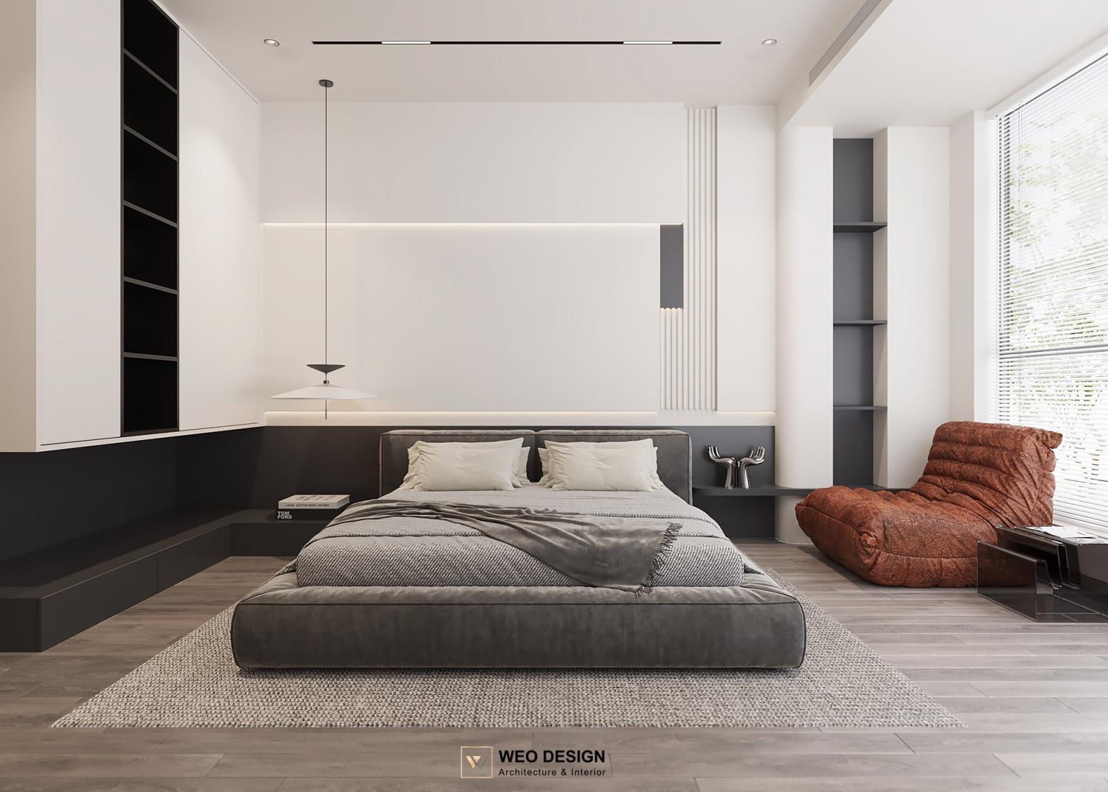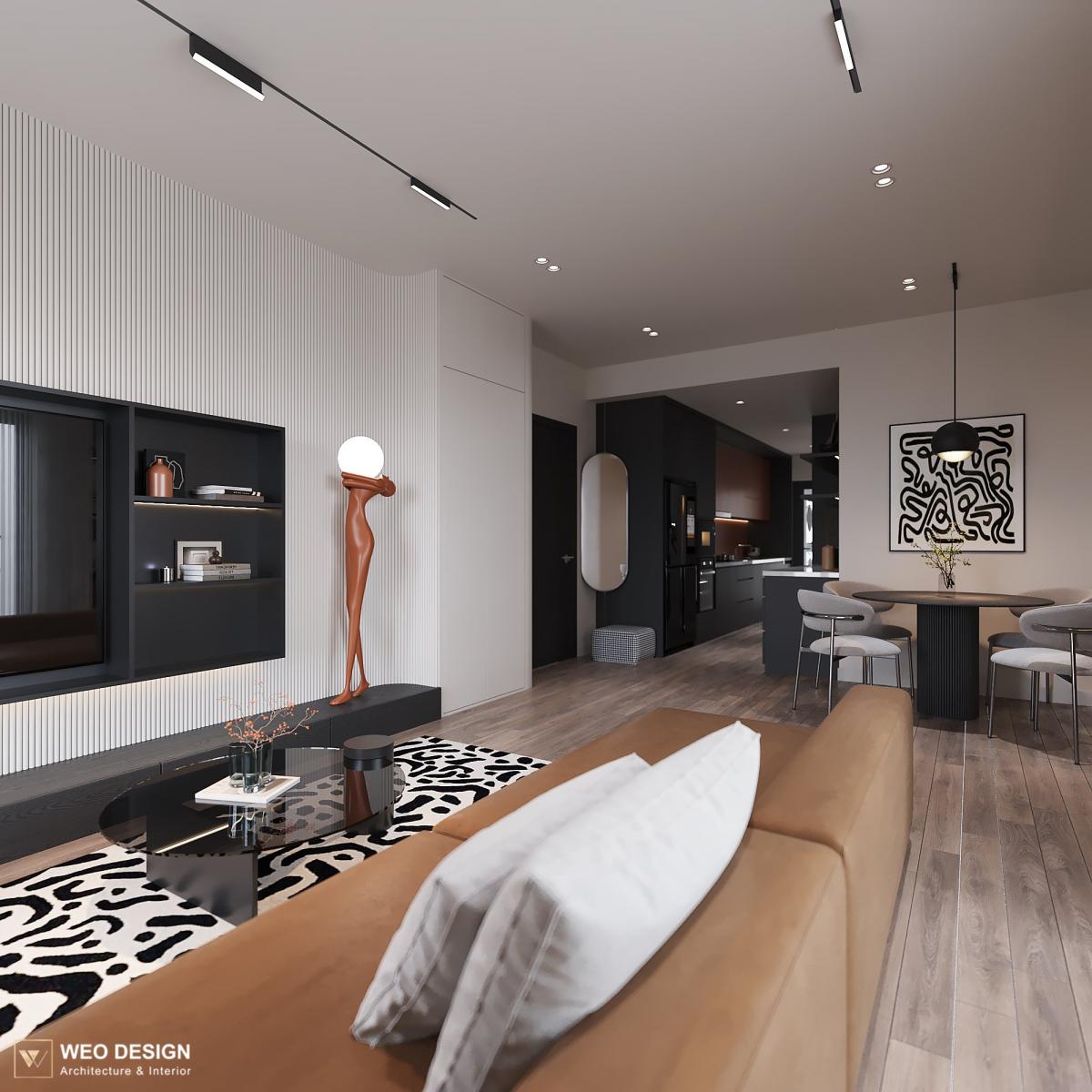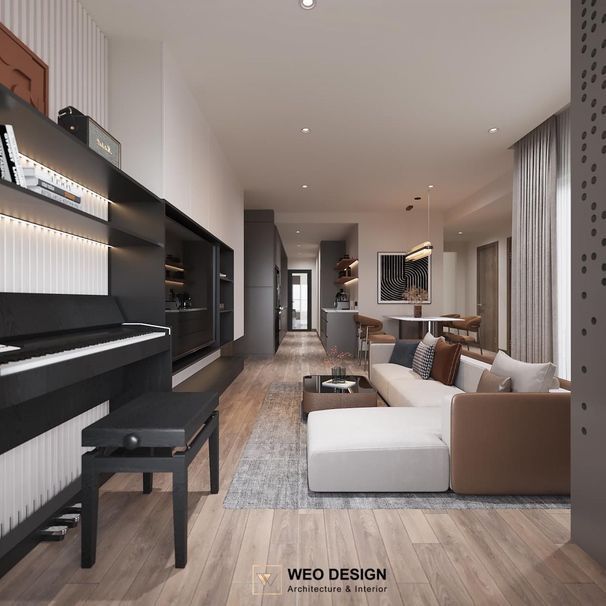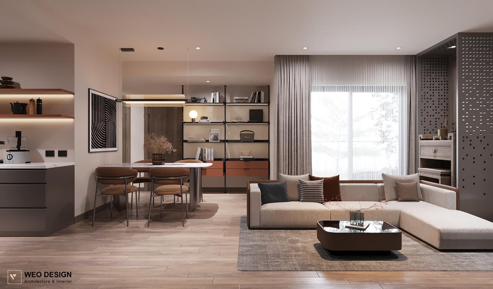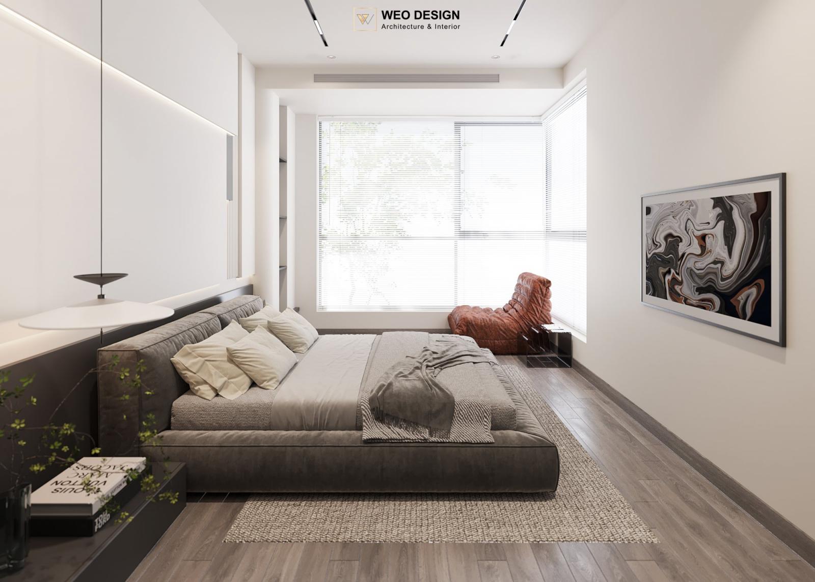 Không gian sống đề cao cảm giác tiện nghi nên các diện tường được tối giản chỉ điểm xuyết một vài các bức tranh, hệ tủ đơn sắc. Để tăng thêm cảm giác ấm cũng, WEO đã bố trí ánh sáng tự nhiên tràn vào không gian qua hệ cửa rộng mở, làm mềm các đường nét cùng gam màu trung tính của nội thất.