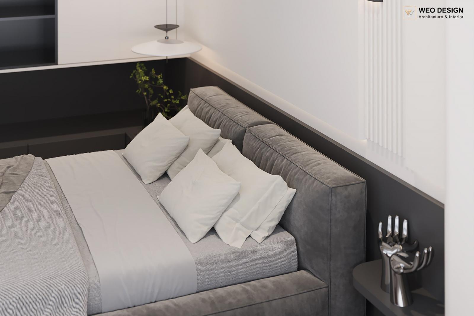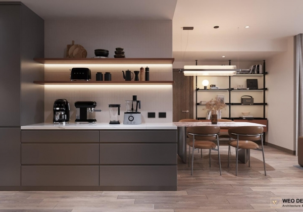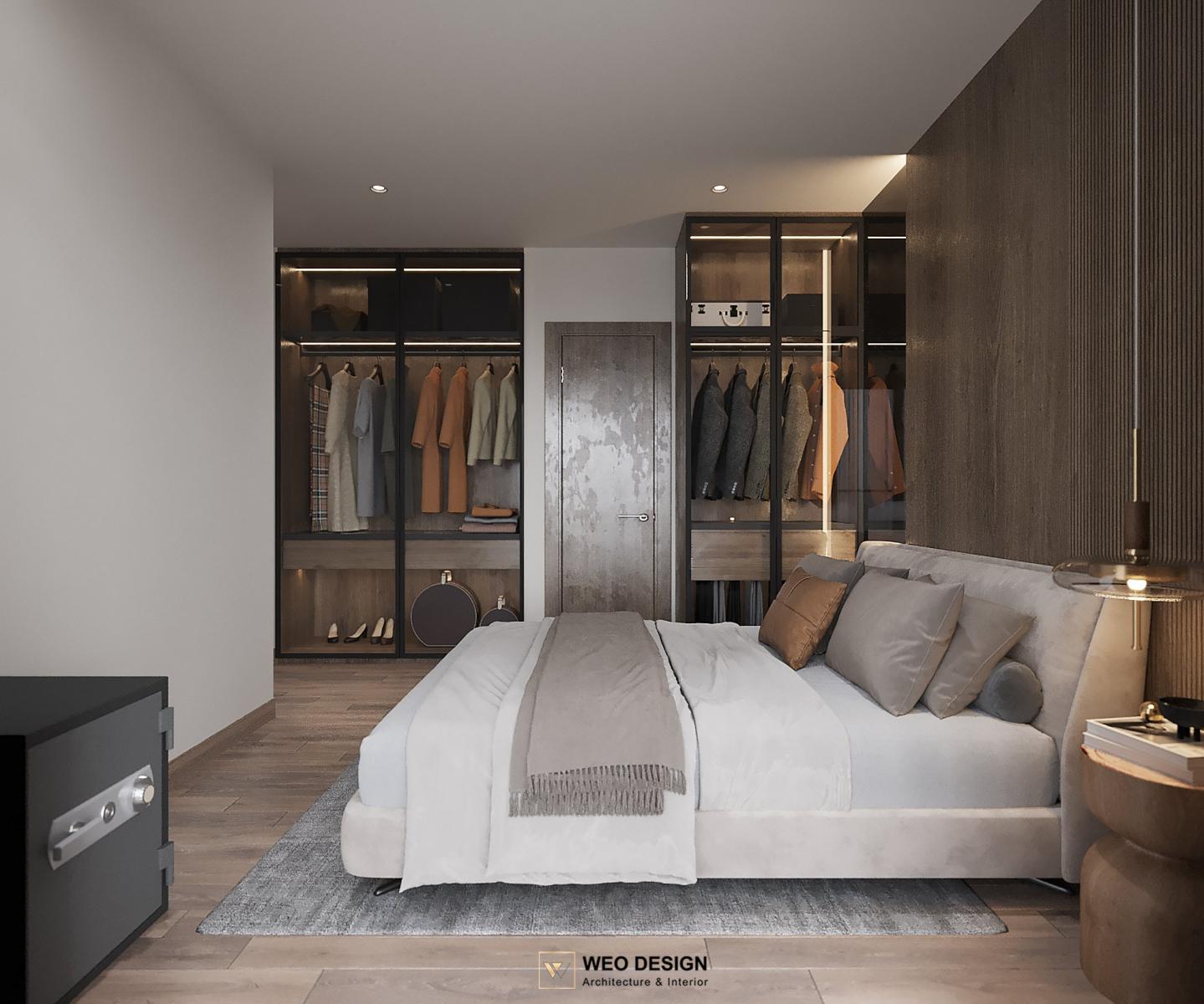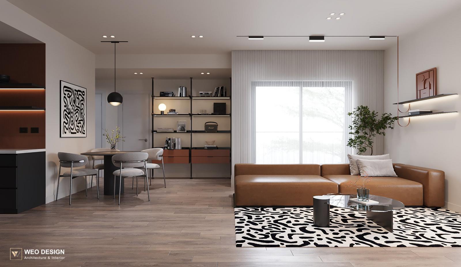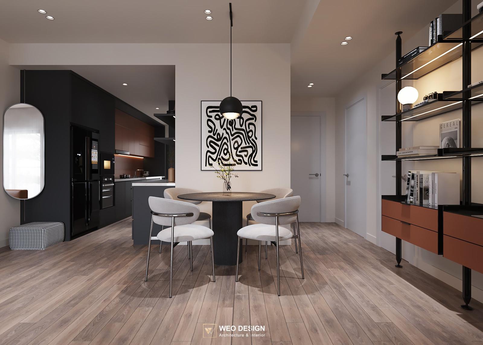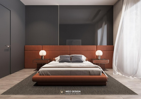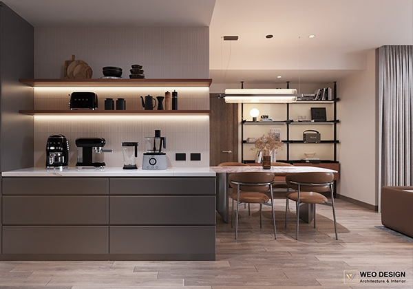 Không gian sống đề cao cảm giác tiện nghi nên các diện tường được tối giản chỉ điểm xuyết một vài các bức tranh, hệ tủ đơn sắc. Để tăng thêm cảm giác ấm cũng, WEO đã bố trí ánh sáng tự nhiên tràn vào không gian qua hệ cửa rộng mở, làm mềm các đường nét cùng gam màu trung tính của nội thất.