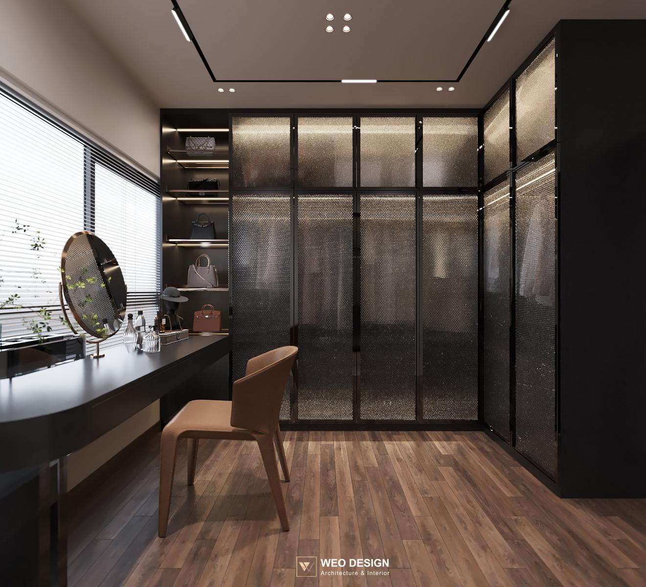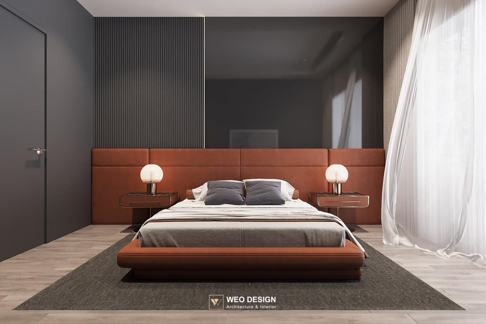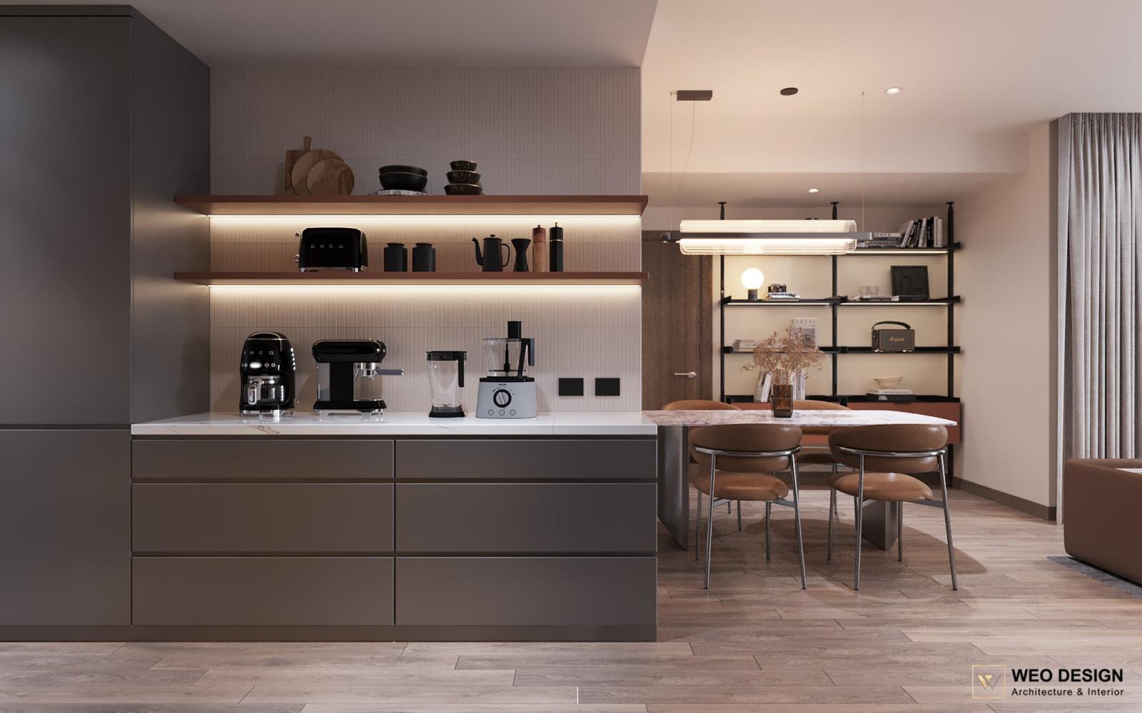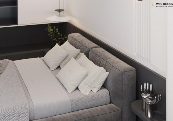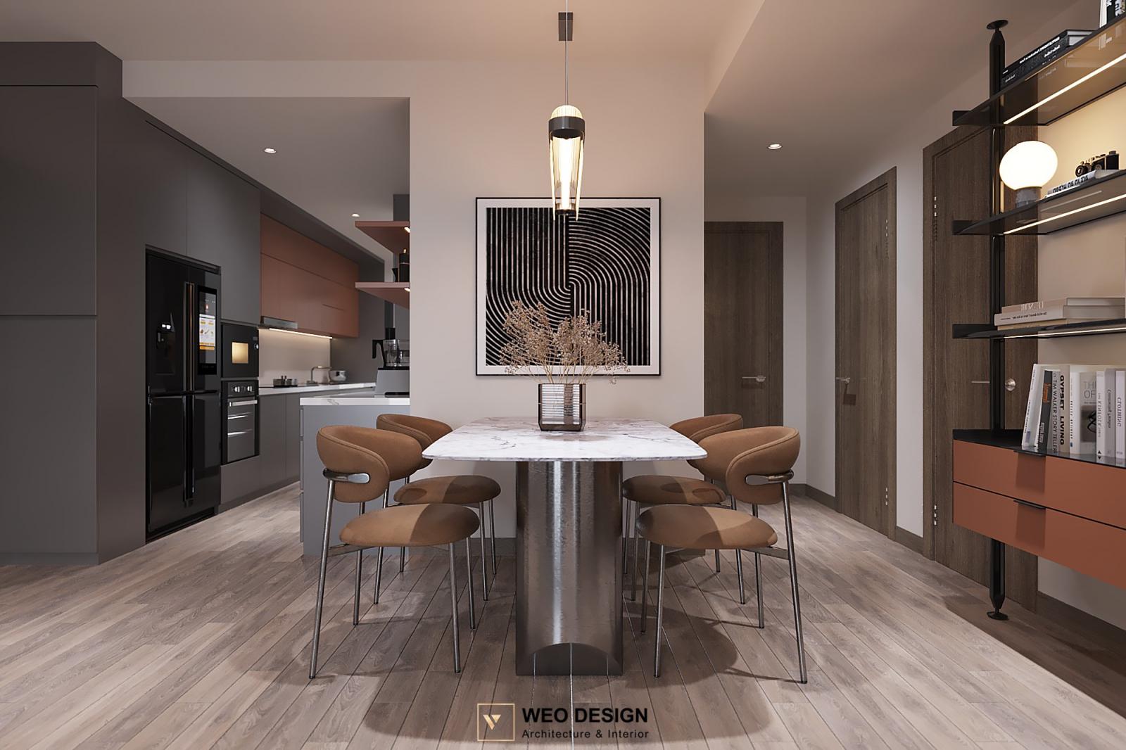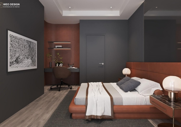 Không gian sống đề cao cảm giác tiện nghi nên các diện tường được tối giản chỉ điểm xuyết một vài các bức tranh, hệ tủ đơn sắc. Để tăng thêm cảm giác ấm cũng, WEO đã bố trí ánh sáng tự nhiên tràn vào không gian qua hệ cửa rộng mở, làm mềm các đường nét cùng gam màu trung tính của nội thất.