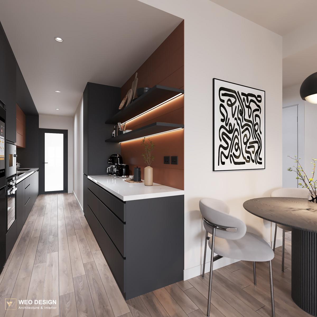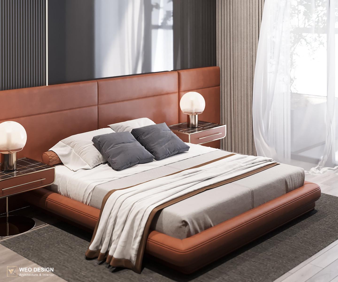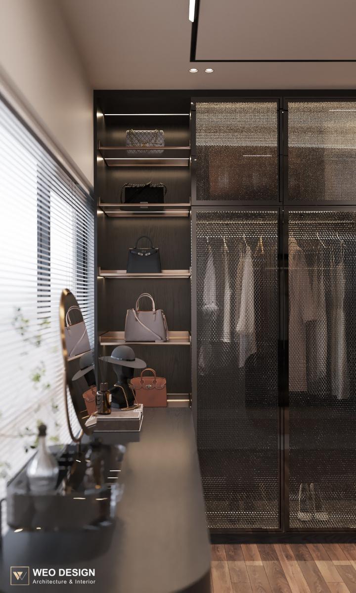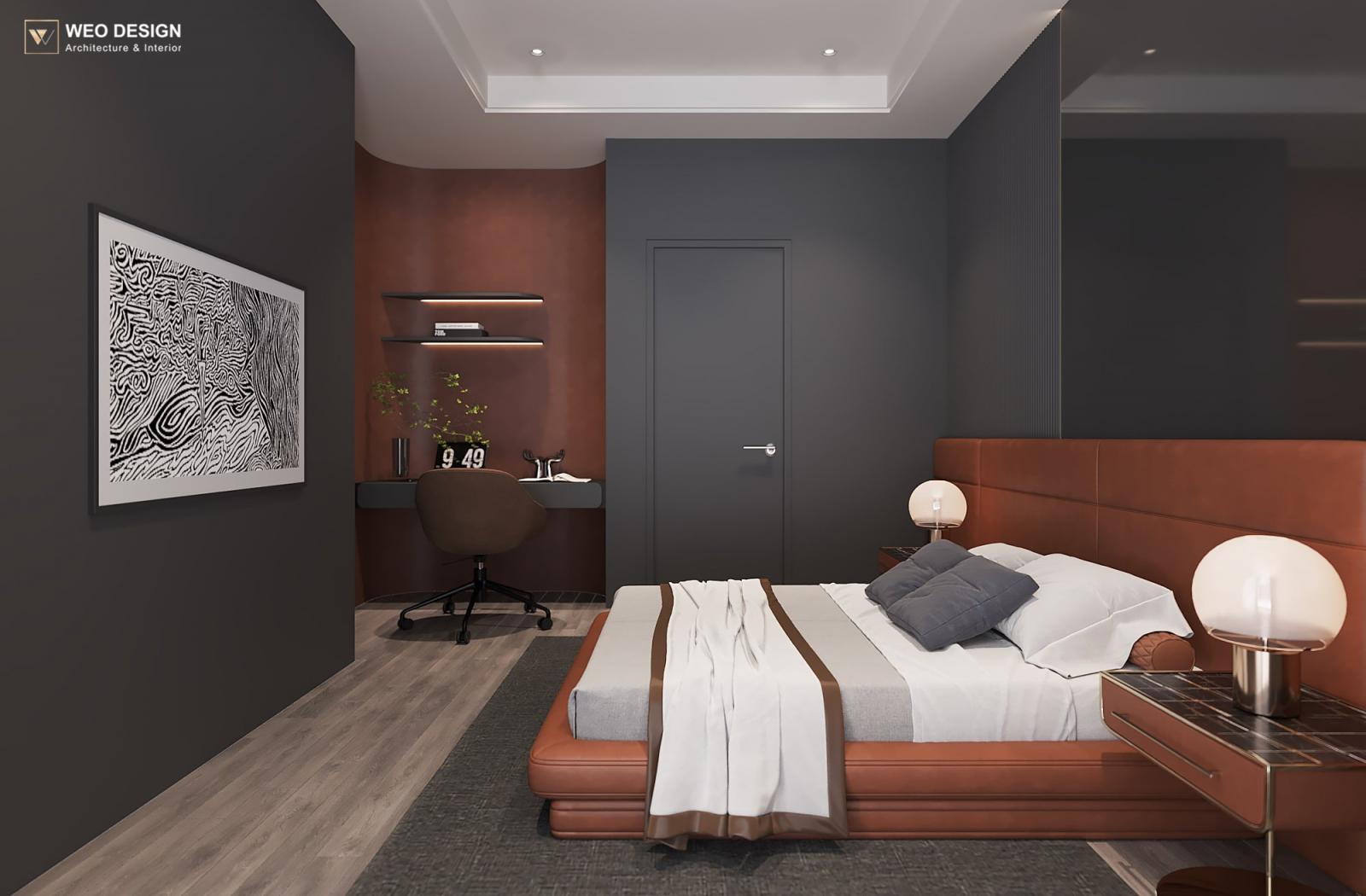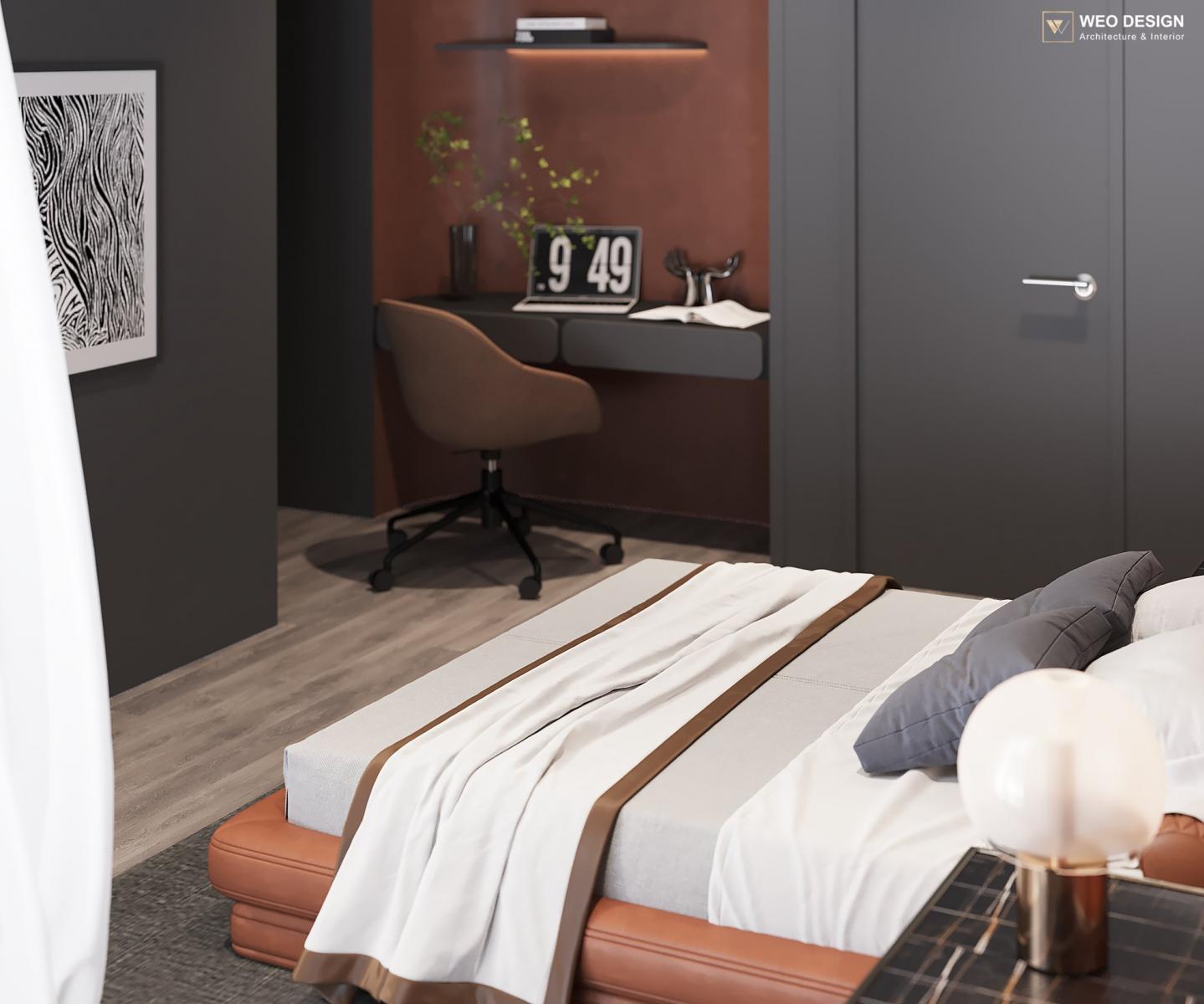 Không gian sống đề cao cảm giác tiện nghi nên các diện tường được tối giản chỉ điểm xuyết một vài các bức tranh, hệ tủ đơn sắc. Để tăng thêm cảm giác ấm cũng, WEO đã bố trí ánh sáng tự nhiên tràn vào không gian qua hệ cửa rộng mở, làm mềm các đường nét cùng gam màu trung tính của nội thất.