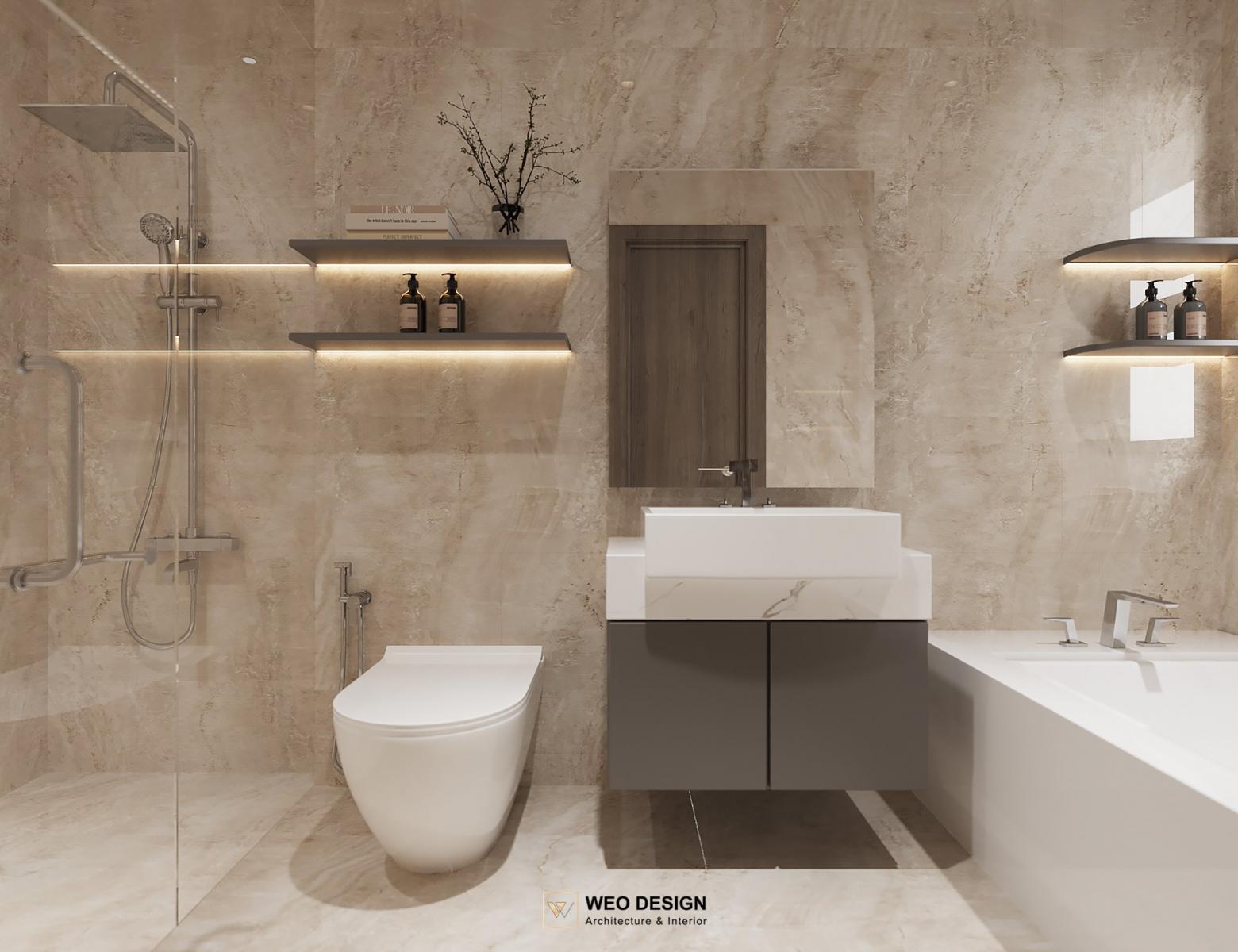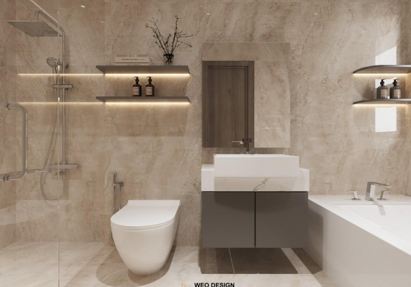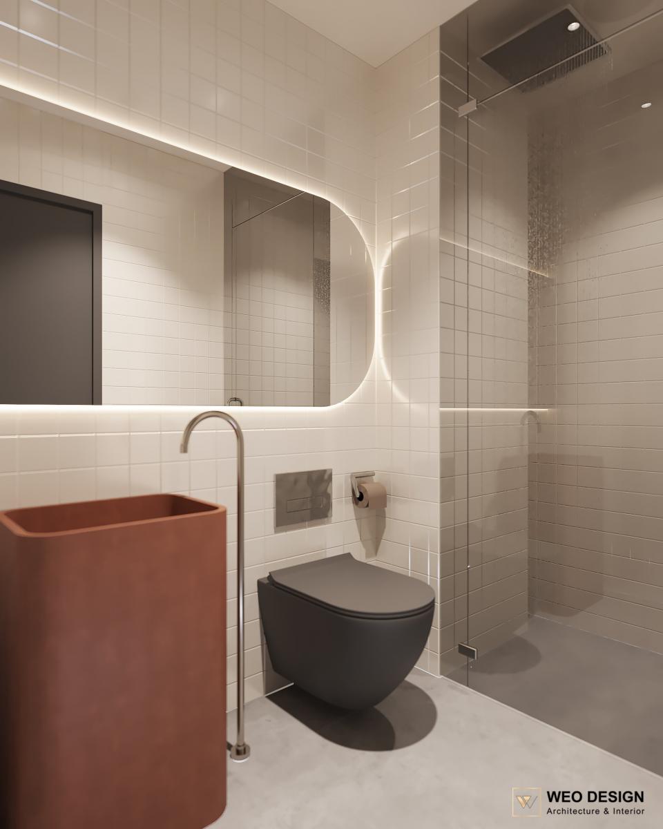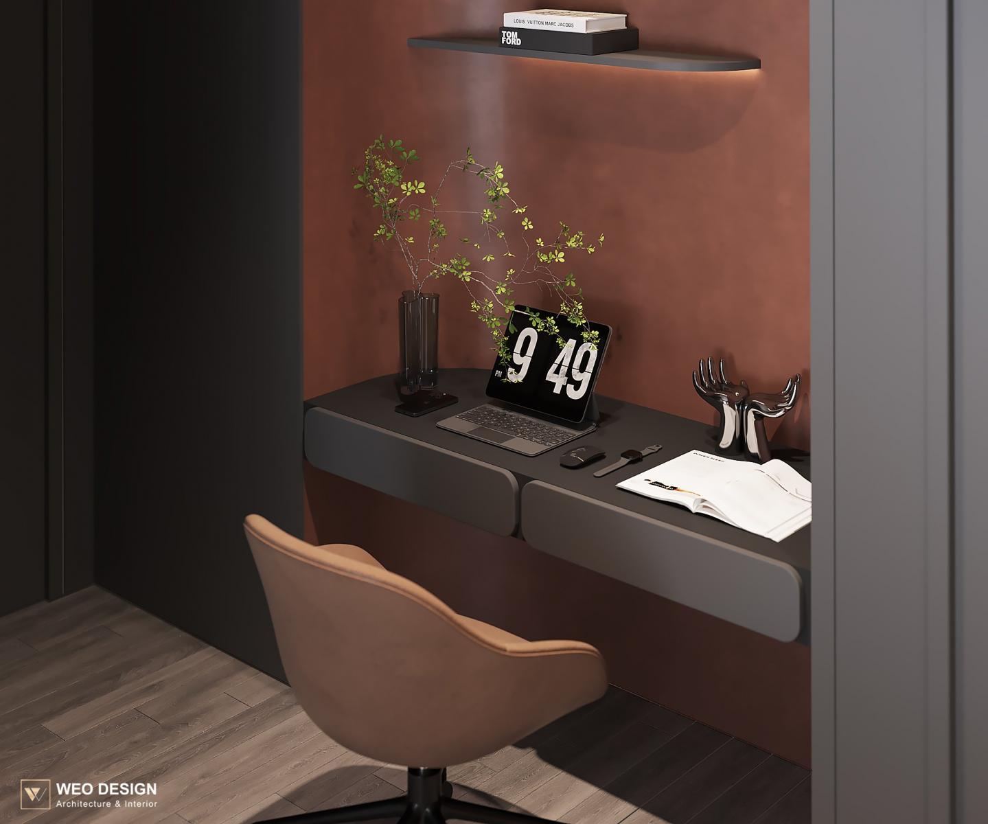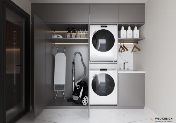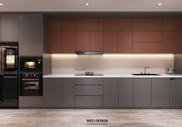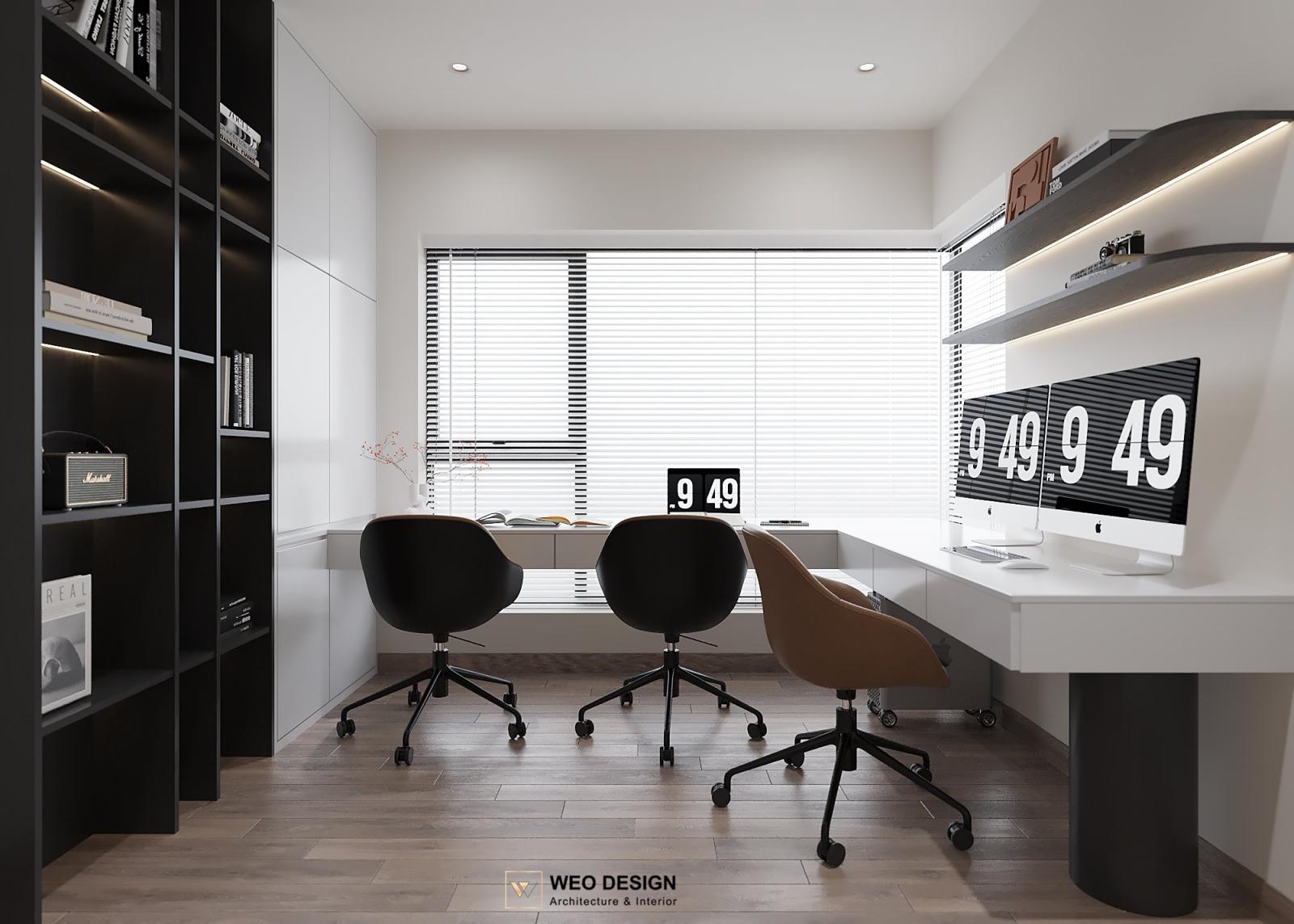 Không gian sống đề cao cảm giác tiện nghi nên các diện tường được tối giản chỉ điểm xuyết một vài các bức tranh, hệ tủ đơn sắc. Để tăng thêm cảm giác ấm cũng, WEO đã bố trí ánh sáng tự nhiên tràn vào không gian qua hệ cửa rộng mở, làm mềm các đường nét cùng gam màu trung tính của nội thất.