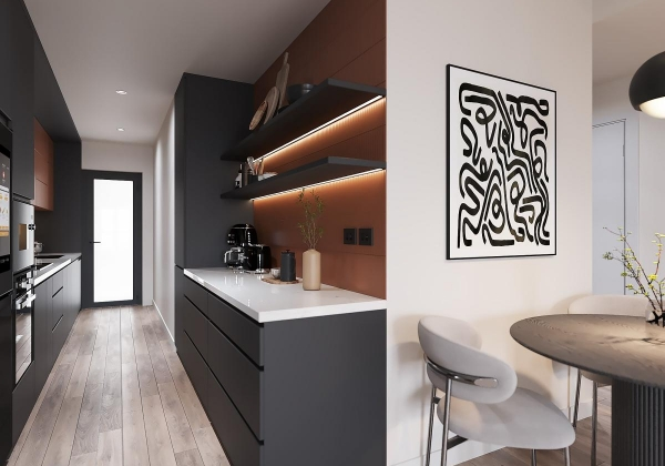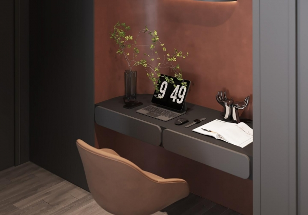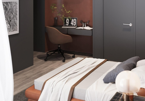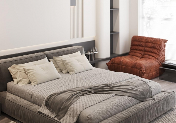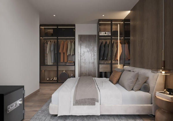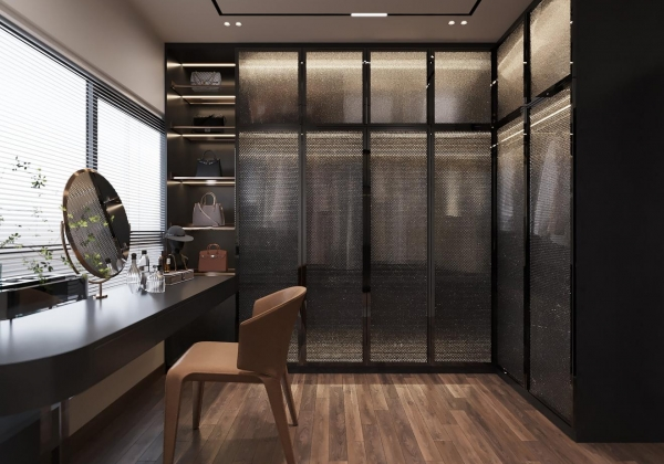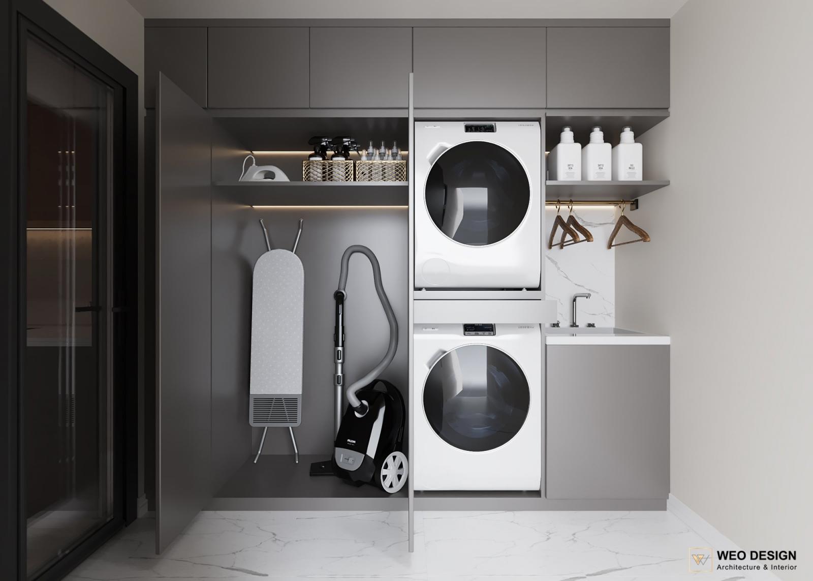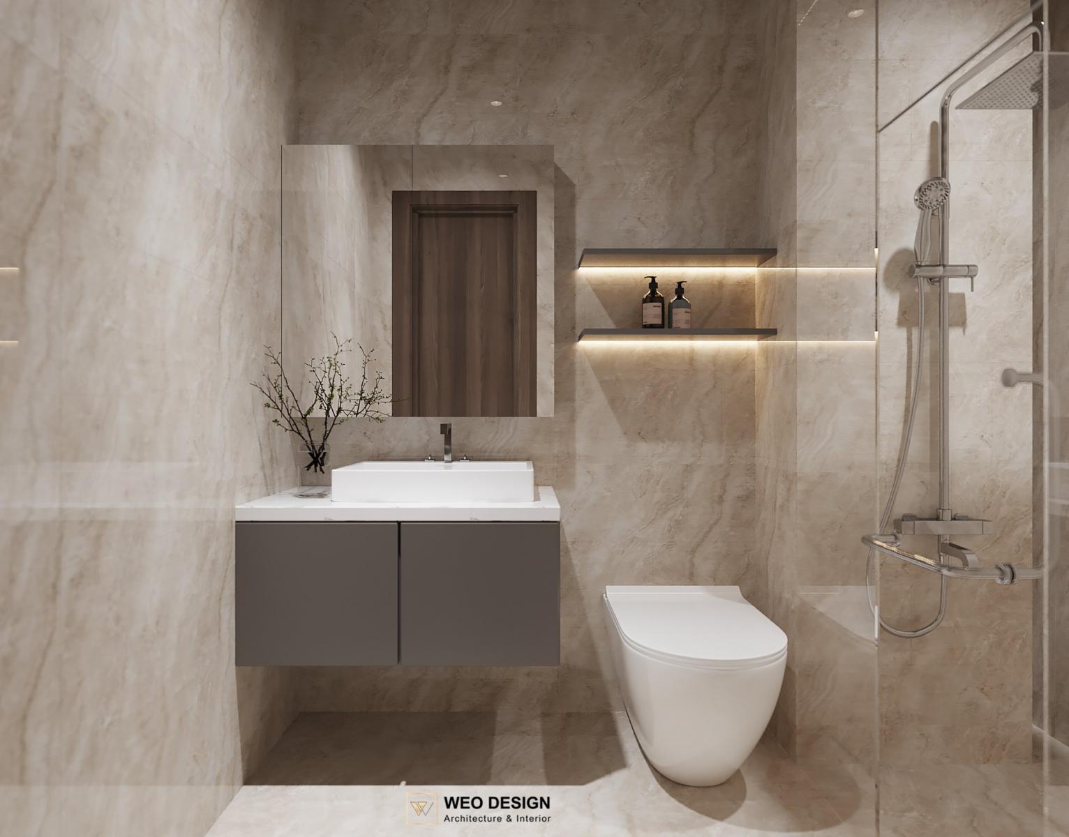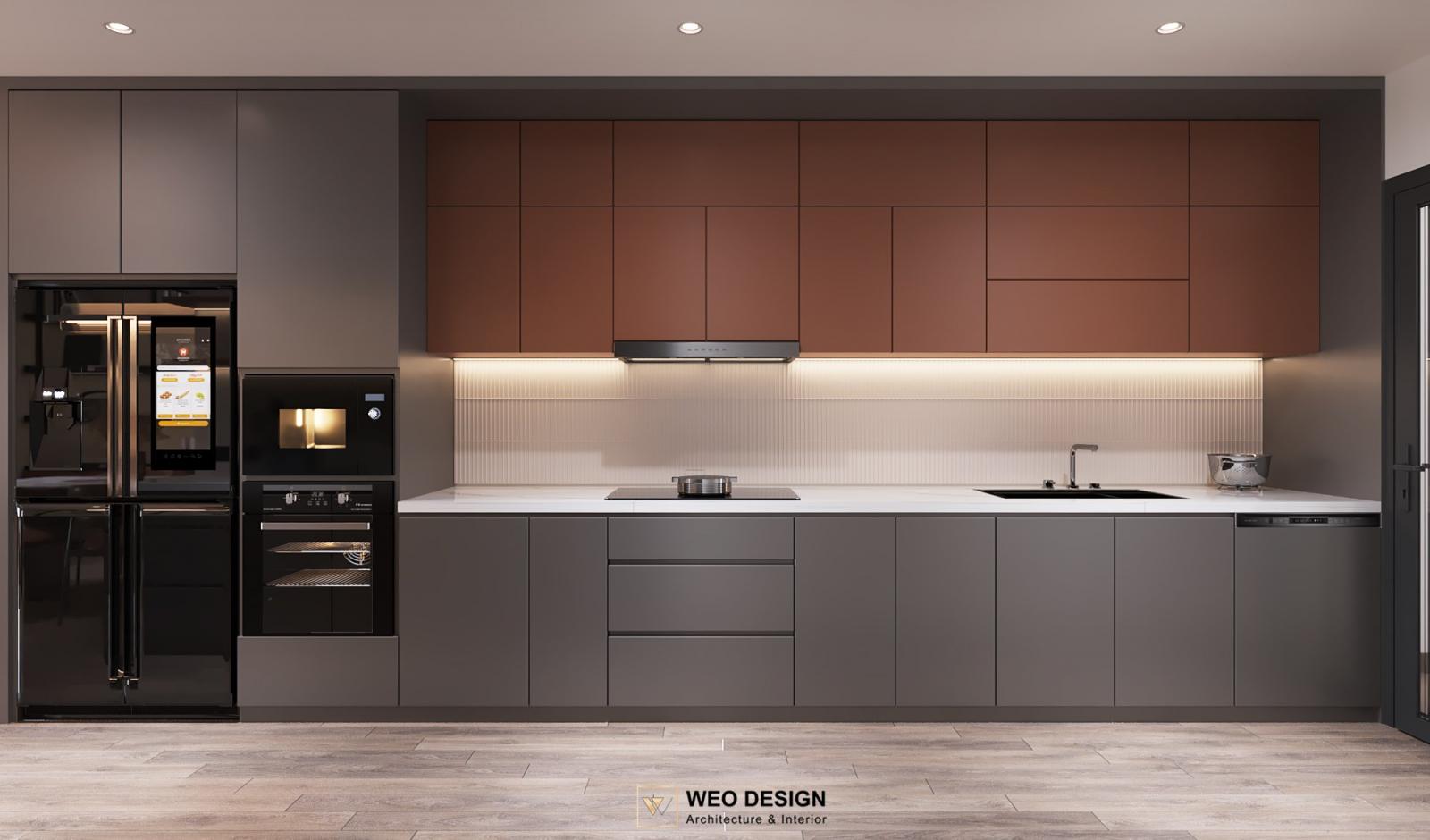 Không gian sống đề cao cảm giác tiện nghi nên các diện tường được tối giản chỉ điểm xuyết một vài các bức tranh, hệ tủ đơn sắc. Để tăng thêm cảm giác ấm cũng, WEO đã bố trí ánh sáng tự nhiên tràn vào không gian qua hệ cửa rộng mở, làm mềm các đường nét cùng gam màu trung tính của nội thất.