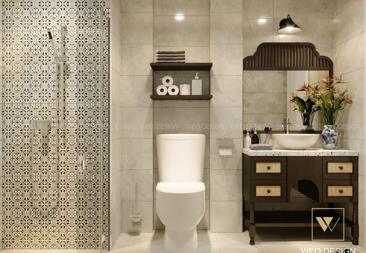Nhà vệ sinh được bày trí đơn giản nhưng cũng không kém phần sang trọng. Tông màu kem kết hợp với hoa văn đen trắng giúp mang lại cảm giác mát mẻ, những ánh đèn vàng thả mô phỏng được không gian cổ điển, ấm áp.
